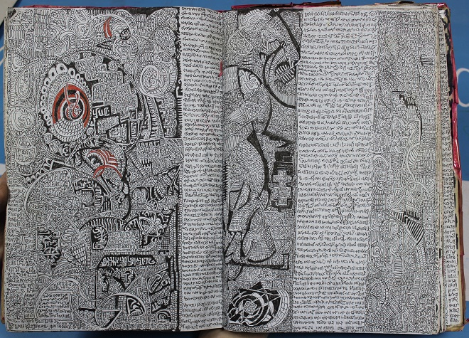 'З зошитів сам роблю журнали. Мої роботи містичні. У них я використовую давнє ексклюзивне письмо з Саудівської Аравії. У малюнках є давні шрифти. Писав їх сам, з голови'.